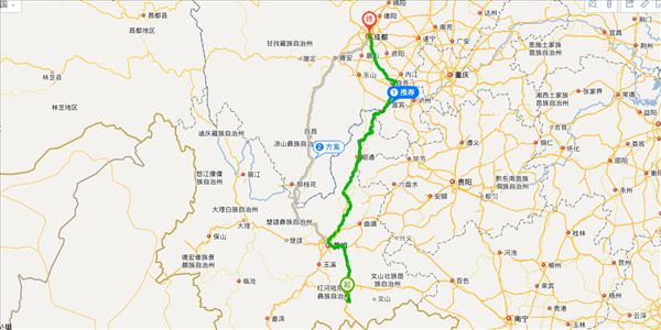 方案三:红河大道公路、瑞临线公路、秀河线公路、汇康桥公路、S209公路、会阿线公路、沪瑞线公路、易天线公路、兰磨线公路、040干道公路、二一三线公路、昭待二级公路公路、关高线公路、下河坝大桥公路、S307公路、五指山隧道公路、佑君街北段公路、三江北街公路、平安大道公路、成仁路公路、天府大道南延线公路、天府大道南段公路、人民南路四段公路,用时1天6小时2分钟,共1101公里。(不走高速,不用过路费)