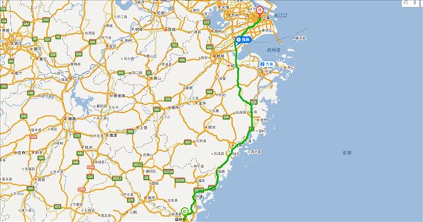 方案二:福州绕城高速公路、沈海高速公路、常台高速公路、沪昆高速公路,用时9小时27分钟,共771公里。