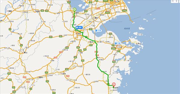 方案二:长深高速公路、杭州绕城高速公路、沪昆高速公路、杭州湾环线高速公路、常台高速公路、沈海高速公路、台金高速公路,用时4小时29分钟,共354公里。