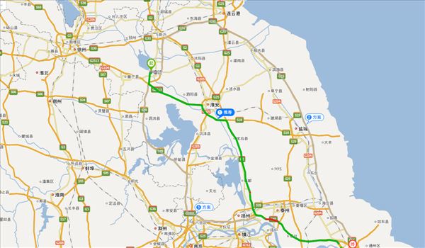 方案二:宿迁支线公路、淮徐高速公路、长深高速公路、盐淮高速公路、沈海高速公路,用时4小时0分钟,共392公里。(时间最快)