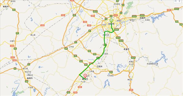 方案二:沈阳绕城高速公路、沈海高速公路、千山西路公路,用时1小时28分钟,共114公里。(时间最快)