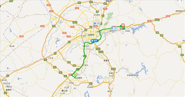 方案一:中大线公路、沈营线公路、沈营大街公路、沈抚大道公路,用时2小时58分钟,共109公里。(路程最短)