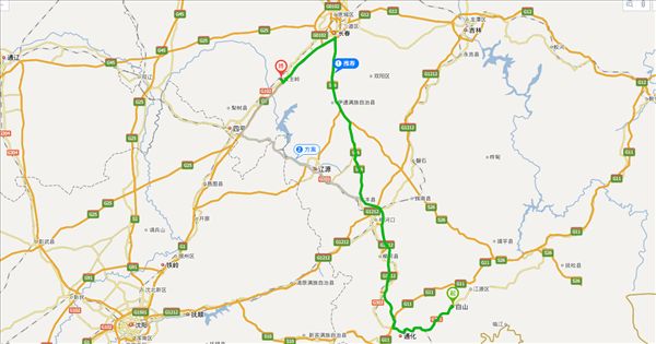 方案一:鹤大线公路、集双高速公路、营梅高速公路、长营高速公路、长辽高速公路、京哈高速公路,用时4小时23分钟,共368公里。(路程最短)