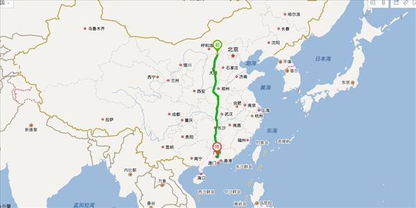 方案一:二广高速公路、宁洛高速公路、焦桐高速公路、新泌高速公路、随岳高速公路、岳临高速公路、京港澳高速公路、华南快速干线公路,用时23小时47分钟,共2169公里。(最快)