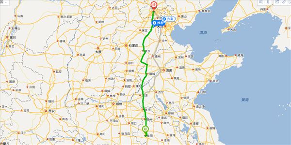 方案二:济广高速公路、济南绕城高速公路、京台高速公路、京沪高速公路,用时9小时50分钟,共898公里。(时间最快)