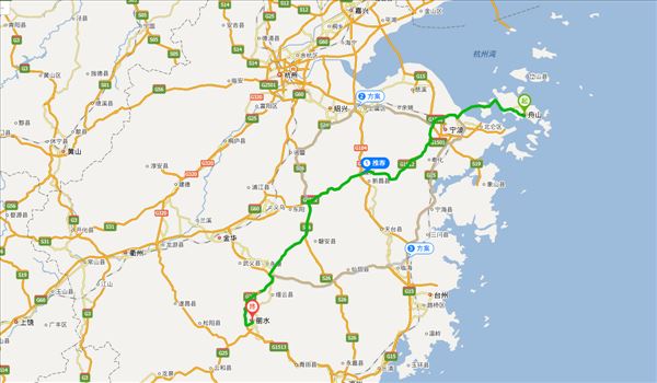甬舟高速、三四省道、三六省道、甬金高速、S310、诸永高速、东永高速、石四线、碧街路、温寿线,用时6小时46分钟,共357公里。