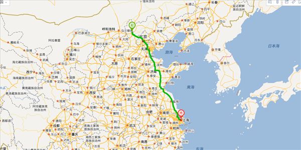 张承高速、京藏高速、北五环路、东五环路、京津高速、京沪高速、荣乌高速、长深高速、滨莱高速、青银高速、沈海高速、沪嘉高速,用时16小时35分钟,共1412公里。