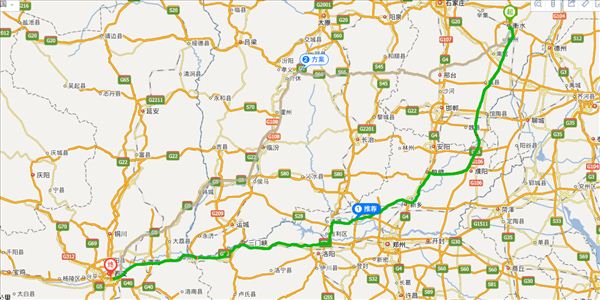 大广高速、濮鹤高速、京港澳高速、晋新高速、长济高速、二广高速、连霍高速,用时9小时42分钟,共909公里。