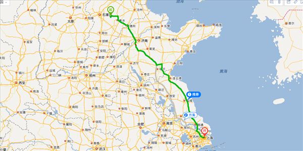 黄石高速、大广高速、衡德高速、滨德高速、京台高速、济南绕城高速、泰新高速、京沪高速、沿江高速、沈海高速、沪嘉高速,用时11小时50分钟,共1082公里。