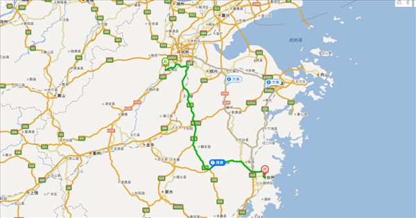 方案一:杭州绕城高速公路、沪昆高速公路、杭州湾环线高速公路、常台高速公路、沈海高速公路、台金高速公路,用时3小时49分钟,共310公里。(最快)