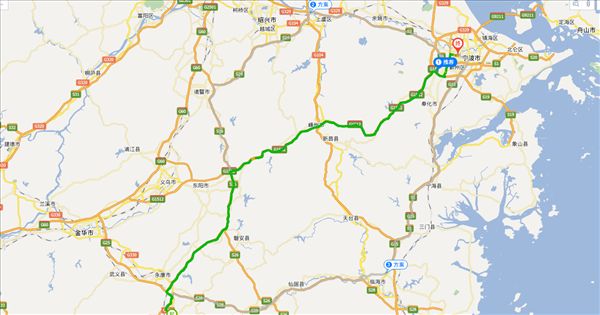 方案一:温寿线公路、石四线公路、东永高速公路、诸永高速公路、里歌线公路、S310公路、甬金高速公路、三六省道公路、雅戈尔大道公路,用时4小时25分钟,共241公里。(路程最短)
