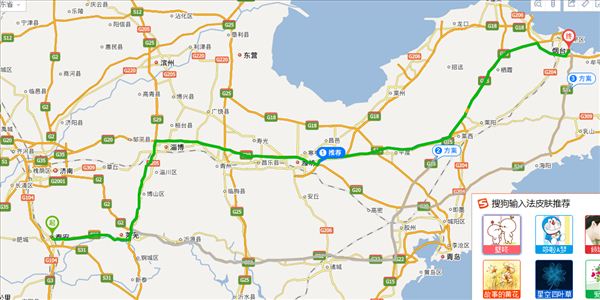 莱泰高速、滨莱高速、青银高速、荣潍高速、沈海高速、荣乌高速,用时5小时39分钟,共505公里。