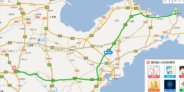 世昌大道、荣乌高速、沈海高速、荣潍高速、青银高速、滨莱高速,用时5小时54分钟,共514公里。