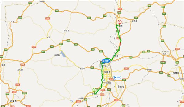 歧银线、太原绕城高速、二广高速,用时1小时55分钟,共125公里。