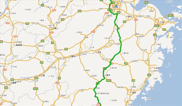 长深高速、杭州绕城高速、沪昆高速、诸永高速、东永高速、云景高速、S228、五二省道,用时6小时47分钟,共483公里。