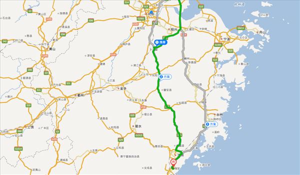 常台高速、S310、诸永高速、温瑞大道,用时6小时44分钟,共391公里。