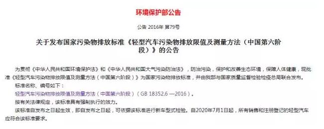 “国六”也称为“轻型车国六标准”,是环境保护部于2016年12月23日发布《轻型汽车污染物排放限值及测量方法(中国第六阶段)》的简称。