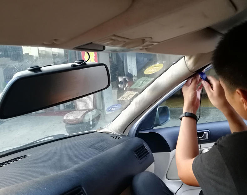 2. 把数据线插入主机,沿着车顶饰板、A驻和密封胶条将线埋好,可以借助尺子或撬板等工具让操作更轻松,最后沿着副驾驶位将线连到点烟器上。需要注意的是,要在主机附近预留一点线,不要拉得太紧,后期插拔会用到。