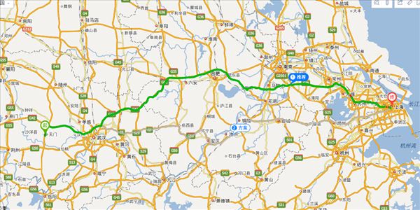 方案二:随岳高速公路、沪蓉高速公路、武汉绕城高速公路、沪陕高速公路、路口枢纽公路、京沪高速公路,用时10小时39分钟,共959公里。(时间最快)