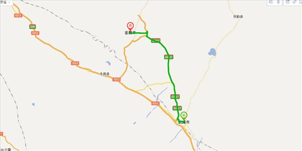 高速入口:沿[永洪段]行驶1.6公里,[右转]行驶320米,朝[金昌|S17方向],[靠左]进入[金武高速]