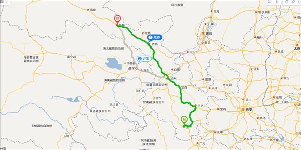 方案一:平绵高速公路、十天高速公路、连霍高速公路、青兰高速公路、京藏高速公路,用时11小时14分钟,共1025公里。(最快、最短)