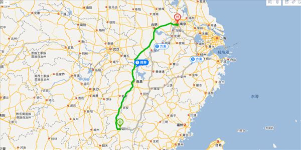 方案二:瑞临线公路、于宁公路公路、厦成线公路、外环路公路、广宁线公路、烟汕线公路、疎山南路公路、S208公路、干越大道公路、鄱余线公路、S222公路、X014公路、沪聂线公路、S321公路、沿新大道公路、长江南路公路、九华北路公路、天门大道南段公路、宁芜公路公路、宁芜大道公路,用时20小时14分钟,共981公里。(不走高速,不用过路费)