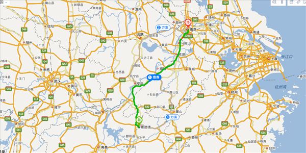 方案一:济广高速公路、安东高速公路、沪渝高速公路、宁芜高速公路、沪蓉高速公路,用时5小时17分钟,共434公里。(最快、最短)