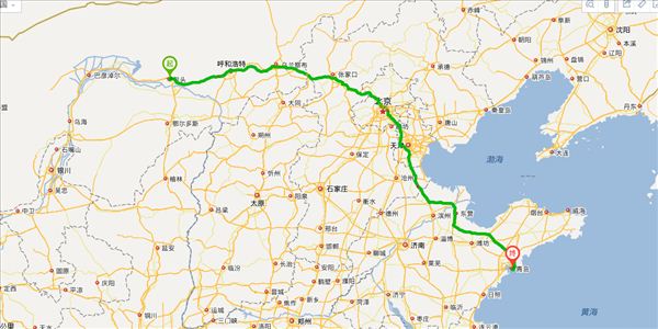 方案二:公路、京银线公路、G110公路、北二环快速路公路、京银路公路、京藏高速辅路公路、京塘路公路、京塘线公路、外环西路公路、津港公路公路、S364公路、S239公路、山深线公路、渤海五路公路、振博大道公路、S323公路、潍高路公路、潍胶路公路、泽安大道公路、康成大街公路、正阳西路公路、环湾路公路,用时1天4小时30分钟,共1370公里。(不走高速,不用过路费)