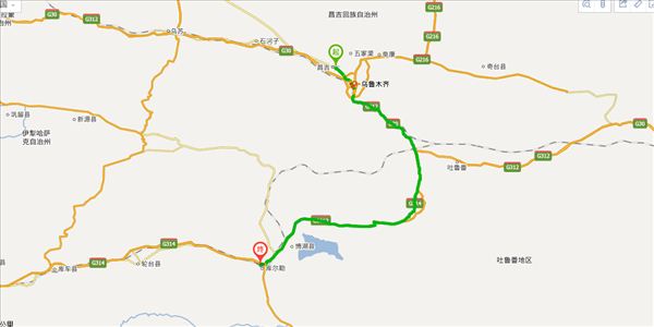 方案二:乌昌快速公路、外环路高架公路、吐和高速公路,用时6小时32分钟,共501公里。(时间最快)