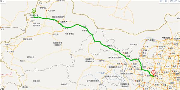 方案一:S205公路、连霍高速公路、吐和高速公路、定武高速公路、京藏高速公路、福银高速公路、青兰高速公路,用时1天8小时28分钟,共3050公里。(最快、最短)