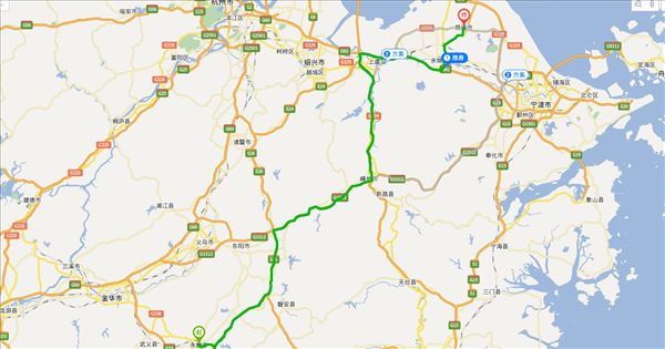 方案二:东永高速公路、诸永高速公路、甬金高速公路、常台高速公路、杭沈线公路,用时3小时25分钟,共229公里。