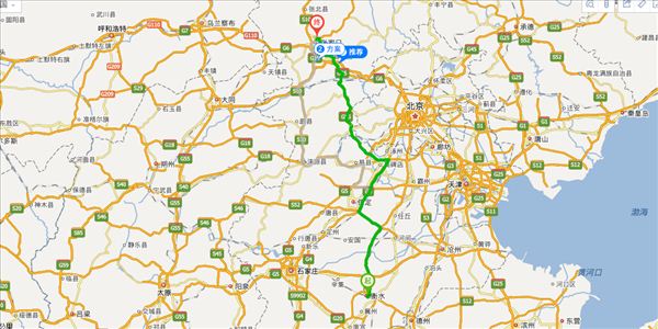 方案一:大广高速公路、保沧高速公路、京港澳高速公路、廊涿高速公路、首都环线高速公路、张涿高速公路、京新高速公路、京藏高速公路、张承高速公路,用时5小时33分钟,共462公里。(最快)