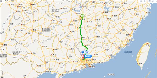 方案二:京港澳高速公路、华南快速干线公路,用时7小时38分钟,共647公里。(时间最快)