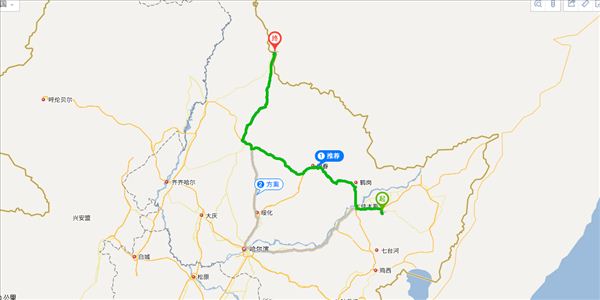 方案一:哈同高速公路、鹤大高速公路、鹤大线公路、青山东大街公路、鹤哈高速公路、前嫩高速公路、绥北高速公路、吉黑高速公路,用时8小时42分钟,共764公里。(最快)