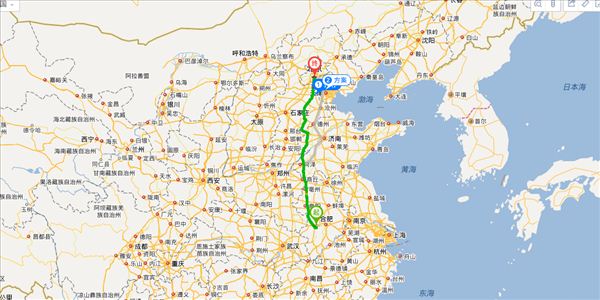 方案二:济广高速公路、济南绕城高速公路、京台高速公路、京沪高速公路,用时11小时44分钟,共1047公里。(时间最快)