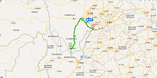 方案二:S310公路、京昆线公路、巧蒙线公路、昭巧二级公路公路、迎宾大道公路、昭待二级公路公路、麻水线公路、盐连路公路、真武路公路、S206公路、S309公路、S308公路、宜珙路公路,用时17小时4分钟,共659公里。(不走高速,不用过路费)
