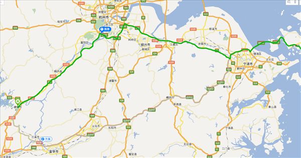 方案二:杭新景高速公路、长深高速公路、杭州绕城高速公路、沪昆高速公路、杭州湾环线高速公路、甬舟高速公路,用时4小时8分钟,共359公里。(时间最快)