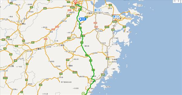 方案二:沈海高速公路、温州绕城高速公路、诸永高速公路、沪昆高速公路、杭州绕城高速公路,用时4小时54分钟,共377公里。(时间最快)