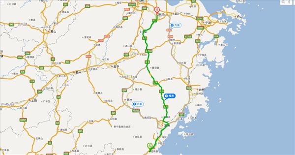 方案二:沈海高速公路、温州绕城高速公路、诸永高速公路、绍诸高速公路,用时4小时13分钟,共345公里。(时间最快)