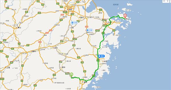 方案三:温寿线公路、京福线公路、东方大道公路、S34公路、三四省道公路、甬临线公路、沿海中线公路、舟山轮渡公路,用时9小时20分钟,共421公里。(不走高速,不用过路费)