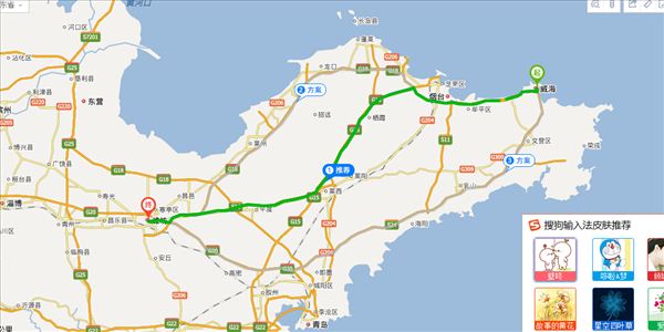 世昌大道、荣乌高速、沈海高速、荣潍高速,用时3小时35分钟,共314公里。