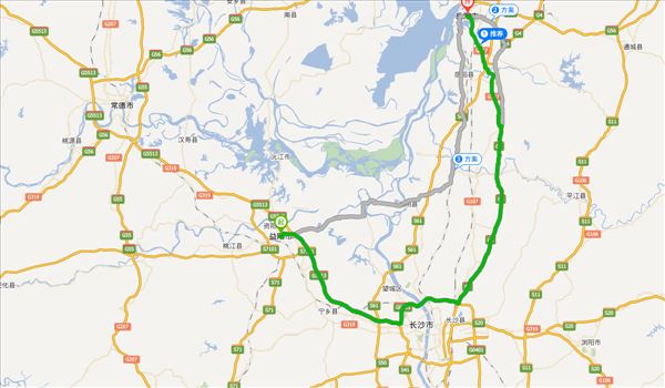 长张高速、长沙绕城高速、京港澳高速、岳阳大道东,用时3小时15分钟,共233公里。