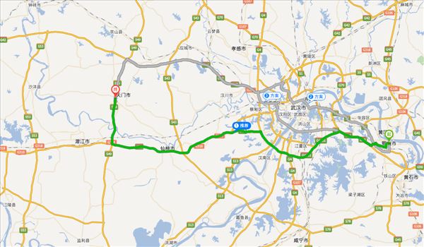 沪渝高速、武汉绕城高速、随岳高速,用时2小时32分钟,共226公里。