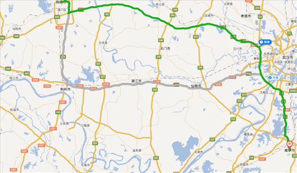 沪蓉高速、武汉绕城高速、京港澳高速、桂乡大道,用时3小时28分钟,共307公里。