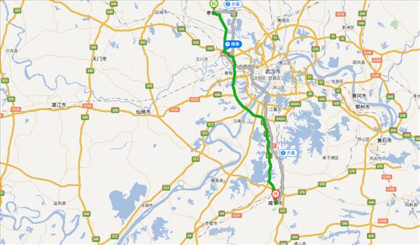 京深线、武汉绕城高速、京港澳高速、桂乡大道,用时2小时5分钟,共141公里。