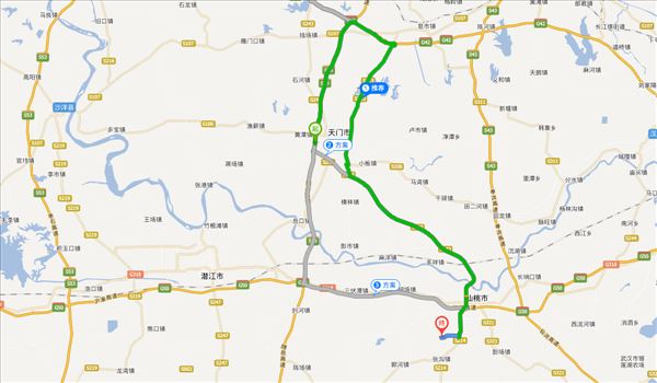 随岳高速、S213、天仙公路、汉江路,用时1小时55分钟,共116公里。