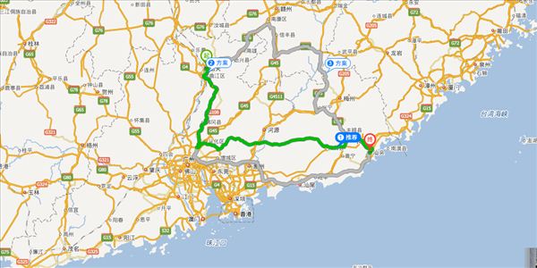 京港澳高速、派街高速、从莞深高速、广河高速、汕湛高速、甬莞高速、潮惠高速、汕昆高速,用时7小时5分钟,共586公里。