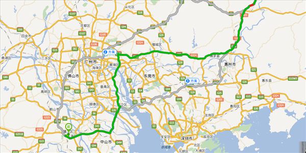 珠三角环线高速、新隆立交桥、广澳高速、莞佛高速、潮莞高速、长深高速,用时4小时16分钟,共272公里。