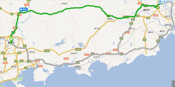 惠州大道、长深高速、汕湛高速、甬莞高速、潮惠高速、汕昆高速,用时3小时45分钟,共300公里。
