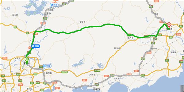 惠州大道、长深高速、汕湛高速、甬莞高速、潮惠高速,用时3小时21分钟,共272公里。